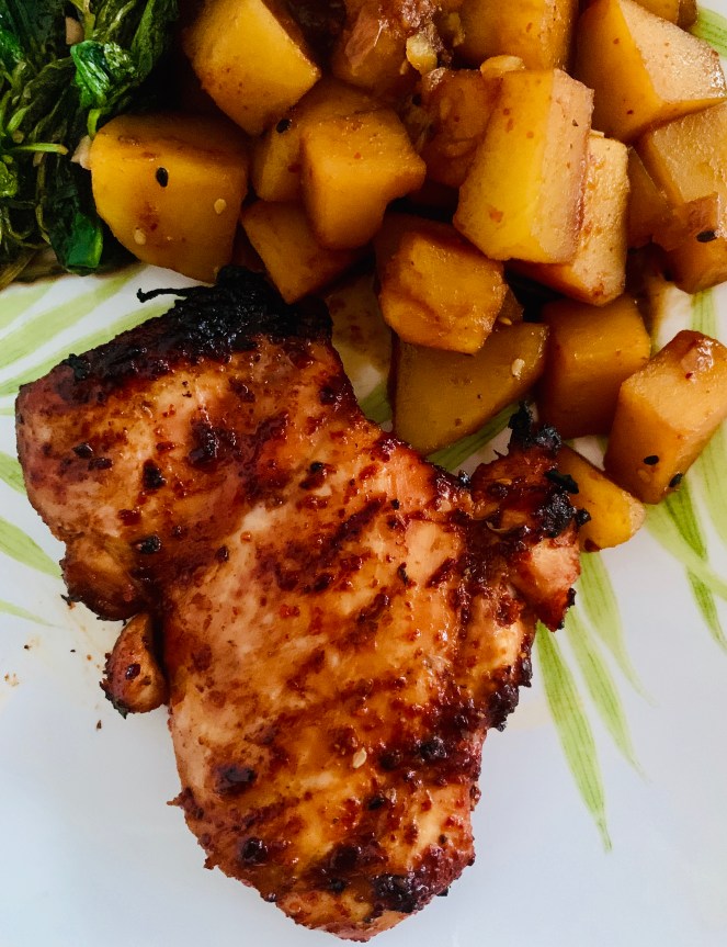 For dinner Matt made gamja jorim and grilled some boneless, skinless thighs he marinated in a bulgogi- inspired mixture similar to this.