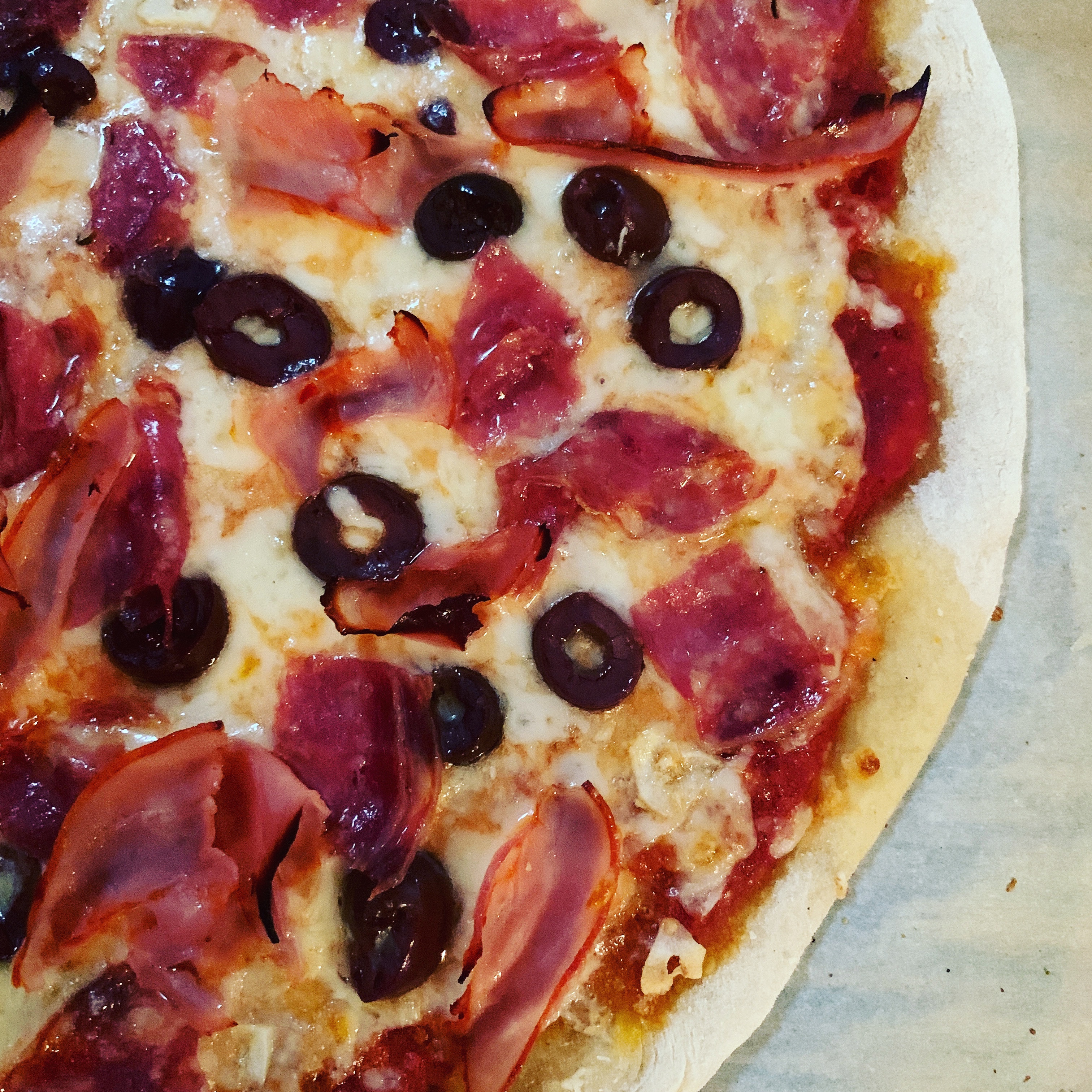 For dinner Matt made pizza. He followed the instructions in the book for the first time and used less yeast and they came out pretty flat. Still tasty though! We used kalamata olives, sopresseta and capicola for toppings and mozz, parm and aged provolone for the cheese!