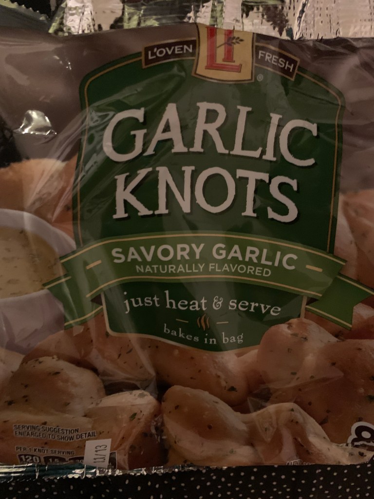 They had one of those huge packs of refrigerated ravioli with sausage (which I don’t think I’ve seen before) for under $6 so I got that. Matt had half for dinner with a simple tomato sauce and the garlic knots. The knots were okay but baked sort of unevenly? Half of each one was pretty good but the other half would be a little chewy and almost fishy tasting.