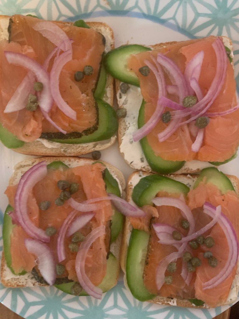 For lunch Matt made us smoked salmon open faced sandwiches with scallion cream cheese, red onion, cucumber and capers using the bread leftover from making shrimp toast last week. So good! I’m glad we’ve been getting smoked salmon, it’s a little pricy but we aren’t spending much money on anything else (besides the roof!!) and we enjoy it.