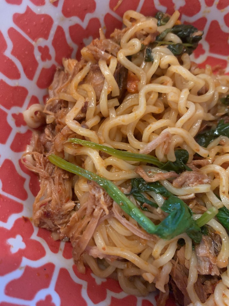 For lunch we had the last of the leftover pork and some spinach in mi goreng.