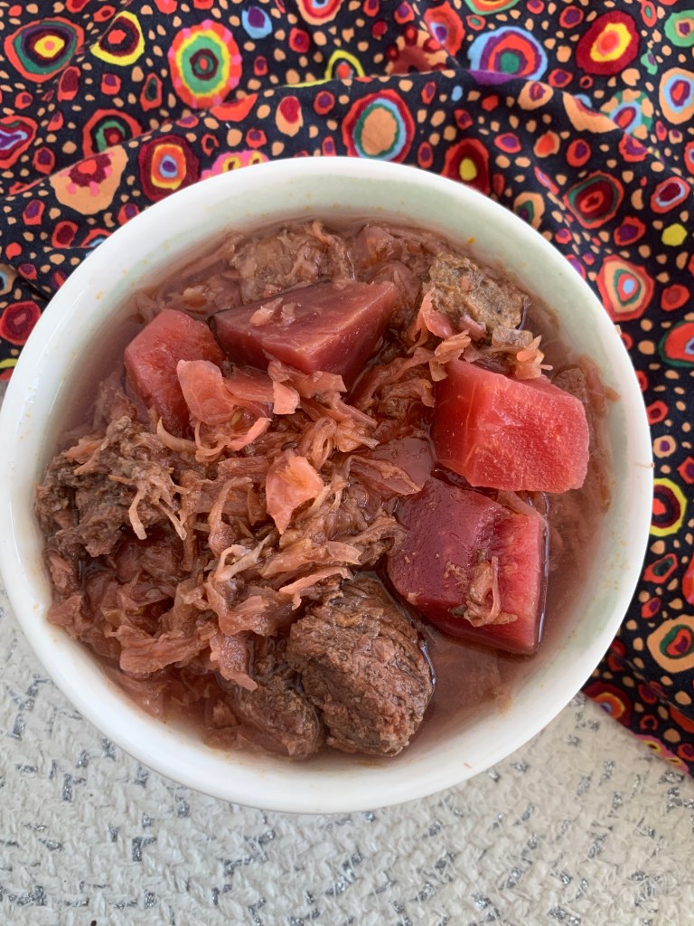 I made a beet-beef-sauerkraut soup in the slow cooker. So good! We have a ton of jars of sauerkraut I swear I bought last fall to use up, we had beets from our produce delivery last week I had roasted on Friday that needed to be used. It turned out great! We made some take and bake bread from Aldi to go with. That bread has been a great find during the pandemic. It’s around $2 and tasty. Not as great as from the Italian store but better and easier than I’d whip up in an afternoon.