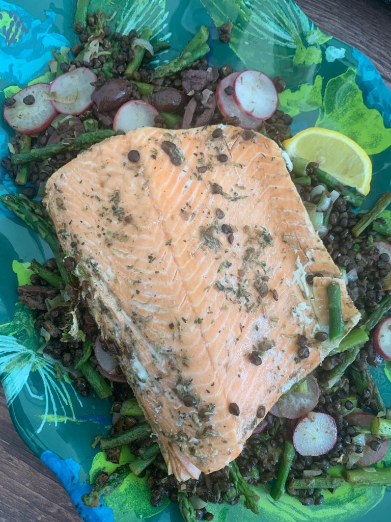 For lunch I made our main meal for the day and made a one skillet meal with salmon (frozen, from Sitka Salmon shares—use my code CALFish for a discount), lentils (parboiled in a pouch from Aldi a while back), asparagus and radishes with some bread from Costco. I don’t know how that asparagus was still good, I think I bought it about 10 days ago. We ate a lot of salad mix last week because I didn’t feel well so we are well stocked with produce.