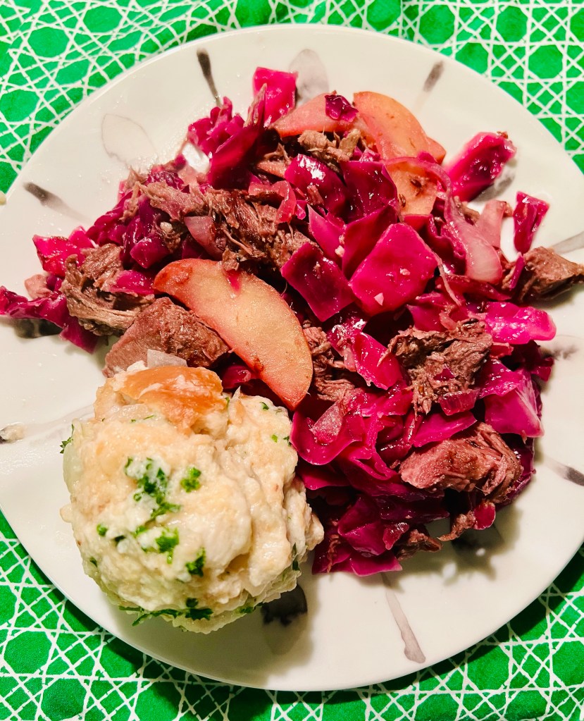 The last couple years I’ve been obsessed with leftover bread recipes for some reason and I’ve been looking for an excuse to make semmelknödel. I had leftover roast so I sautéd that up with red cabbage, some apples, caraway and onions and served the bread dumplings on the side. It was fun making something new. There is another dumpling that’s made with bread and cheese that I think I might make next.