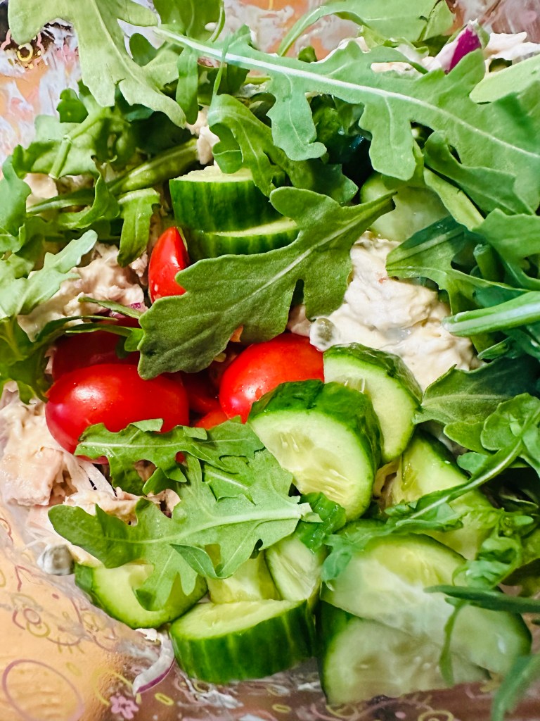 For lunch I made chicken salad with the leftover chicken and had it on salad with leftover tomatoes, leftover arugula and cucumber.