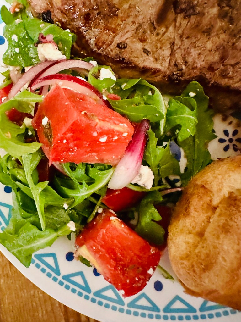 Then for dinner we made salad with some heirloom tomatoes from a local farm, arugula, blue cheese and red onion and had that with popover and steak. We really should make popovers more often! They are so easy!