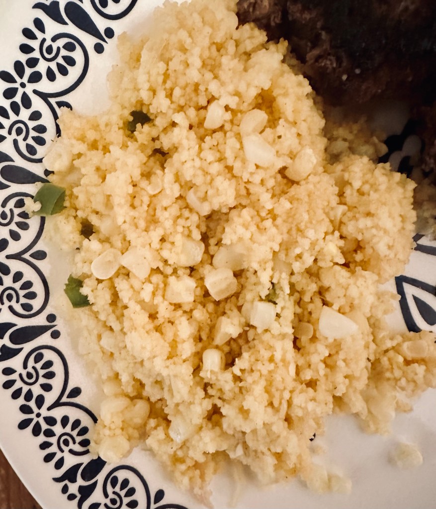 Another chicken sandwich for lunch. Got some work done but next thing I knew it was time for dinner. I made the raw seasoned ground beef we froze into patties and made jalapeño-corn couscous to go with. Not bad! I always forget how quick couscous is to make.