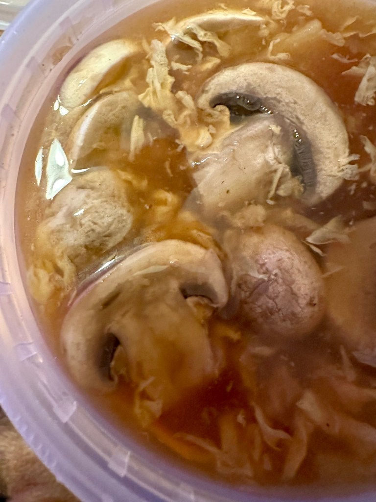 Today’s goal was to go grocery shopping but I had a migraine hangover and didn’t feel up to it so Matt got us sandwiches for lunch. Then he worked late and got us Chinese food for dinner. It’s cold so I got some hot and sour soup. I was off it for a while because it always had a lot of hot pepper seeds in it but it seems like whoever is making it now isn’t doing that.