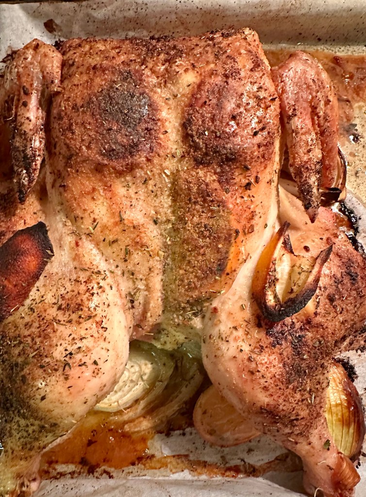 We had a spatchcocked chicken with lemon slices under the skin and on a bed of onions, peppercorn bread made in the bread machine and green beans. Lots of chicken left!