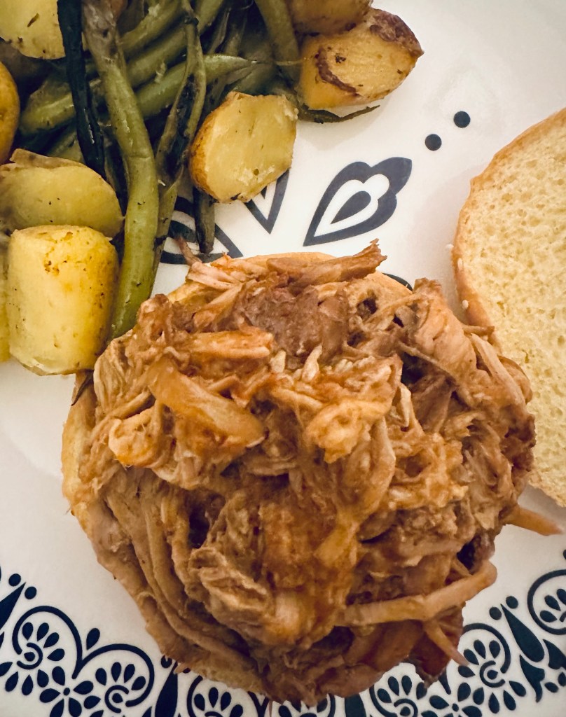 I got up early and put a pork butt in the slow cooker. It was really jammed in there! At around 4:30 it didn’t seem anywhere near done and I was worried we’d have to get take out or something but somehow it was at pull apart texture around 6. it gave off so much liquid I had to siphon some off in the afternoon. Maybe I should have put it in a bigger slow cooker but then I would have had to bulk it up somehow to fill the slow cooker enough to work properly. Anyway, it turned out okay and we have a lot of leftovers. Had it with leftover potatoes and green beans.
