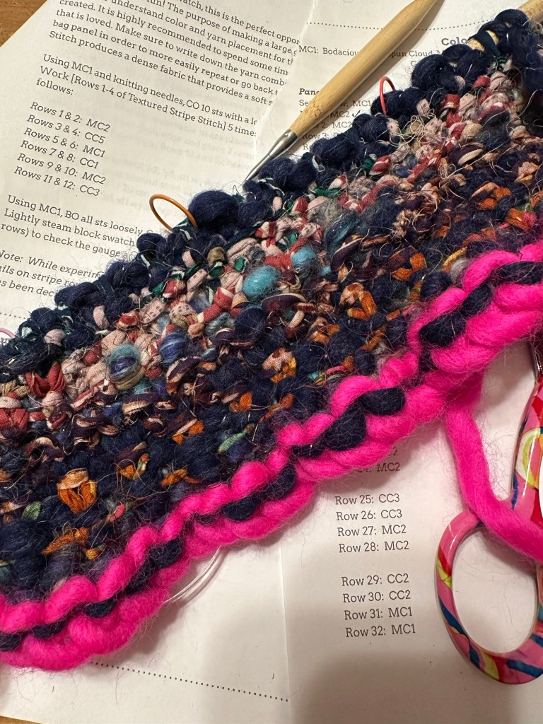 I got a lot of knitting done! I’m still a day behind but I think I can catch up tomorrow. It is a mix of really thick yarn and fabric strips so it is slow going.
