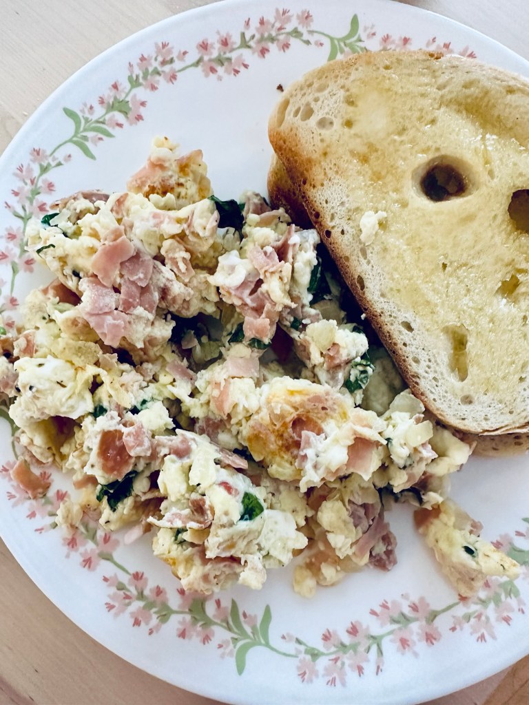 For lunch we had scrambled eggs with leftover meat and basil from the panini and toast.