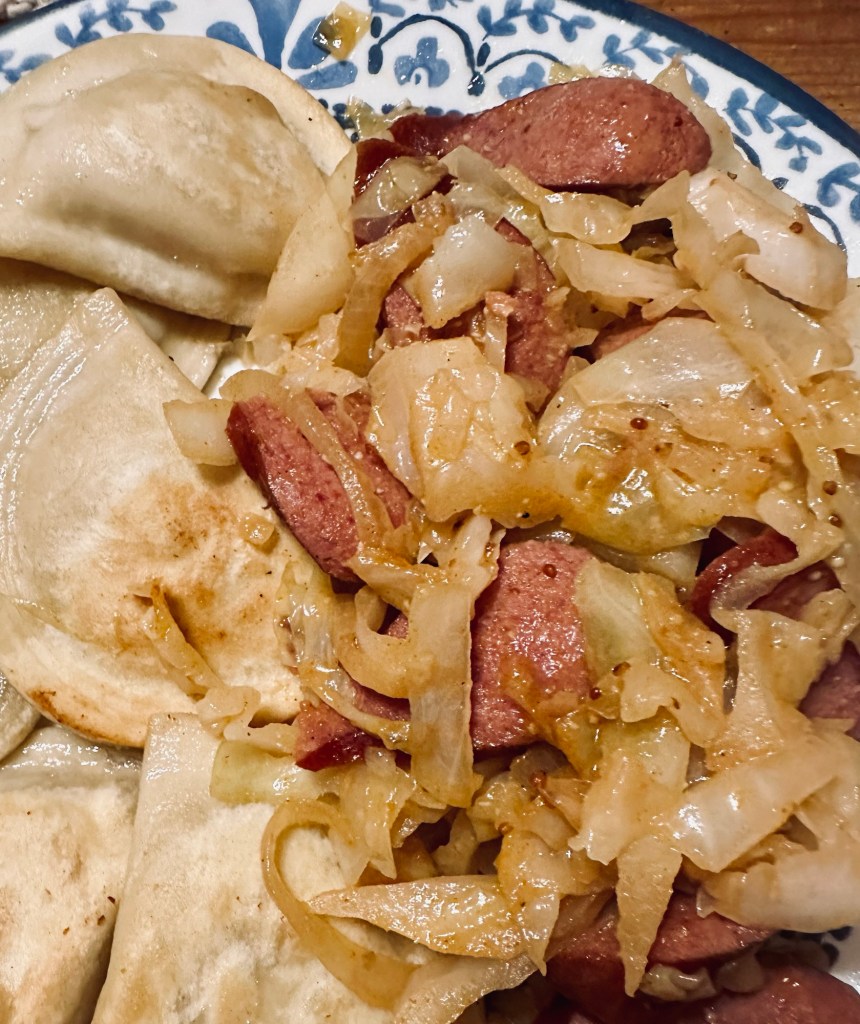 For dinner we sautéed cabbage, onions and kielbasa together and tossed in frozen pierogi. All from Lidl last week. It wasn’t bad but not my favorite frozen pierogi.