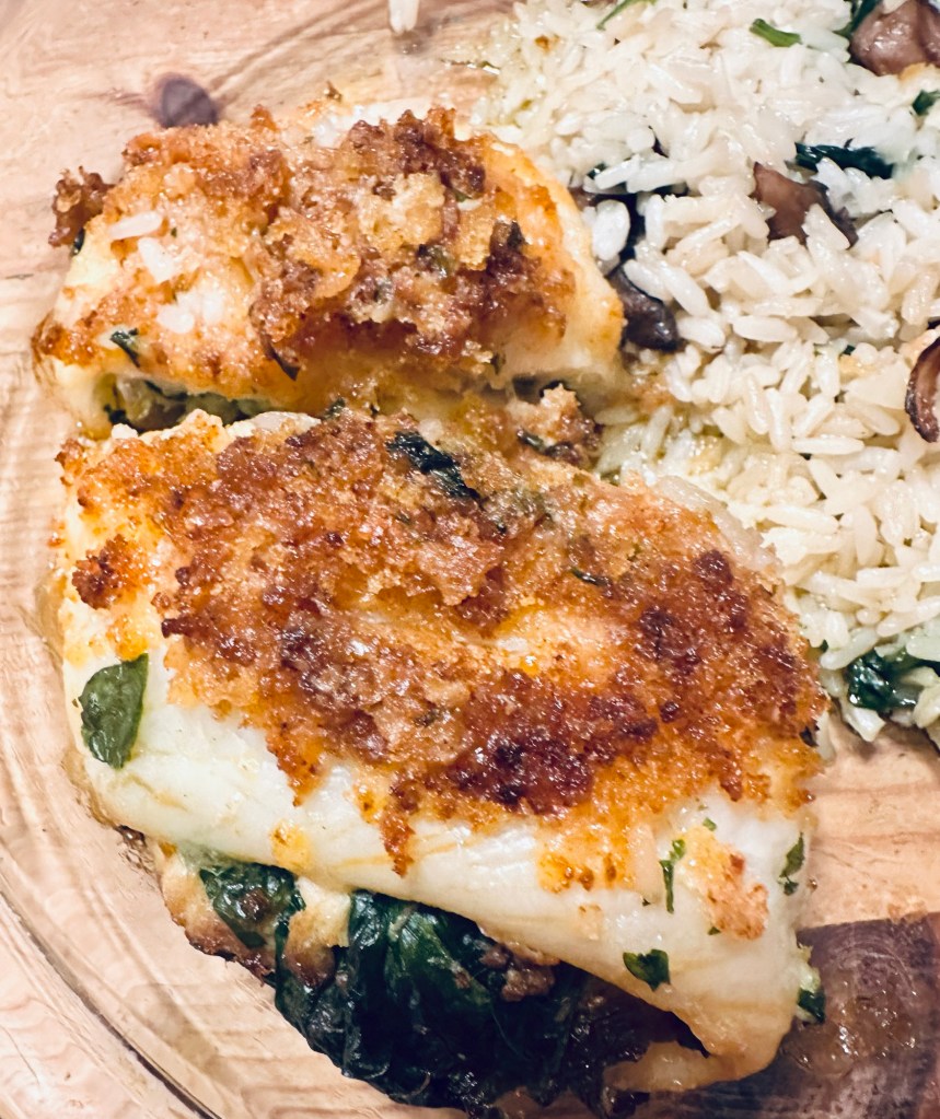 We had stuffed cod and spinach-mushroom rice. Their fish portions are really big! Not the salmon as much as the others but it was a lot of food. He also picked up some tomato cucumber salad so we had that too.