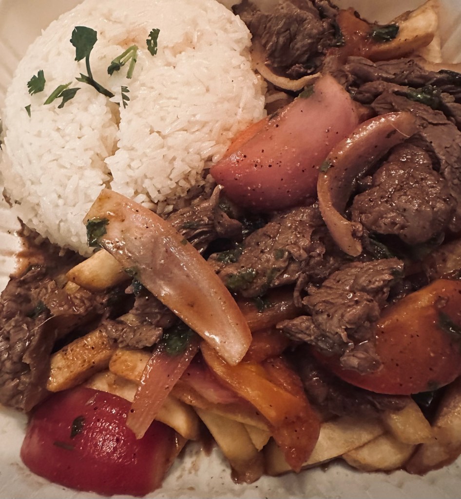 The dinner goal was to make this chicken schnitzel and sides we got at Costco but the chicken was weird. It was cooked but unbreaded? The breading didn’t stick and the chicken looked kind of gross so we ended up getting lomo saltado instead.