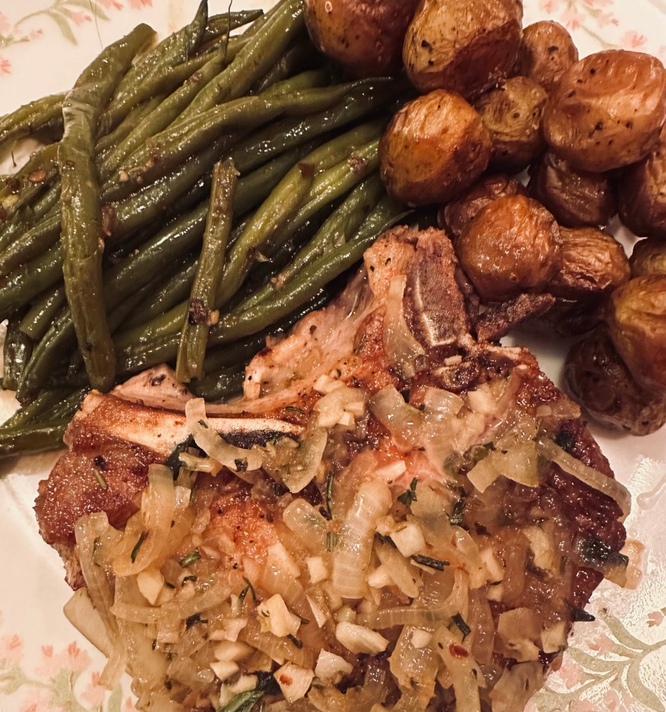 I had some soup for lunch and then Matt made some bone-in pork chops, green beans and roasted potatoes for dinner. I was so hungry!