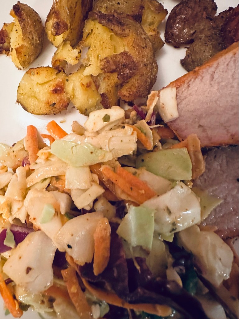 For dinner we smashed the leftover boiled potatoes and had them with pork loin and an oddly spicy bagged salad.