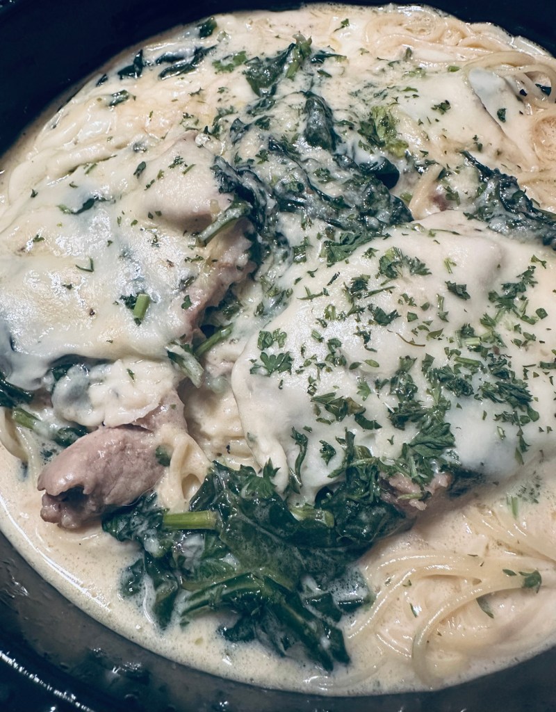 For dinner we had mushroom ravioli topped with spinach, mushrooms and parm.